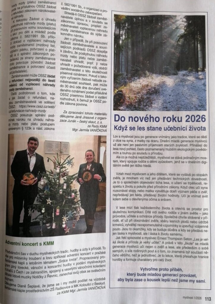 Krásný snímek kočky divoké od Mariána Jamricha nás vítá na lednové titulce Časopis Myslivost. Uvnitř časopisu nás pak na stránkách věnováných Klub Mladí myslivci ČMMJ, z.s. čeká 13. část seriálu Vedení kroužku, která je tentokrát zaměřena na pracovní volno související s akcí pro děti a mládež. Toto téma je pro vedoucí atraktivní a věříme, že každý nejde potřebnou informaci. Materiál zpravovala Jana Jirasová z organizace Junák - český skaut a pro vydání připravila Mgr. Jarmila Vaníčková.
