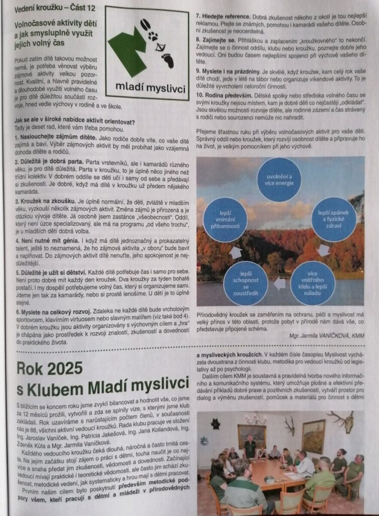 12. část seriálu Vedení kroužku má téma Volnočasové aktivity dětí a jak smysluplně využít jejich volný čas. Další článek představuje shrnutí dění s KMM v roce 2025 Autorkou článků je členka rady KMM a zkušená pedagožka Mgr. Jarmila Vaníčková.
