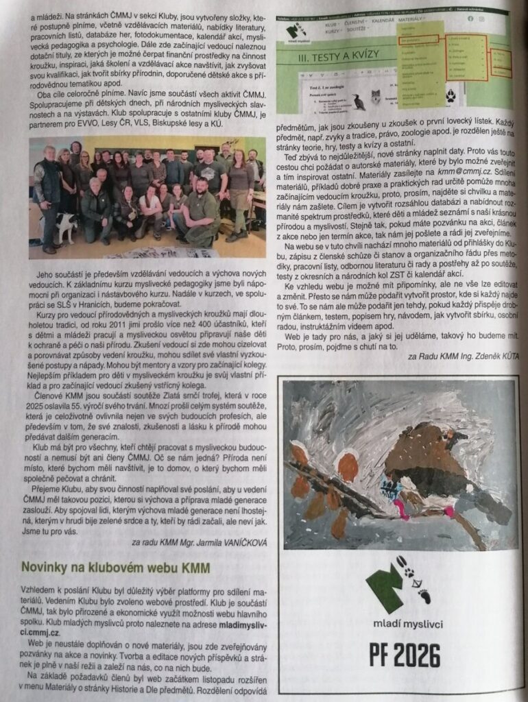 Jsme rádi, že můžeme prostředním Časopis Myslivost přinášet nejen myslivecké veřejnosti pravidelné příspěvky o práci s mládeží a dění v Klub Mladí myslivci ČMMJ, z.s.