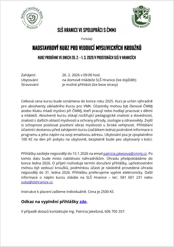 Nadstavbový kurz pro vedoucí mysliveckých kroužků se uskuteční od 26.2. do 1.3.2026 v SLŠ Hranice.