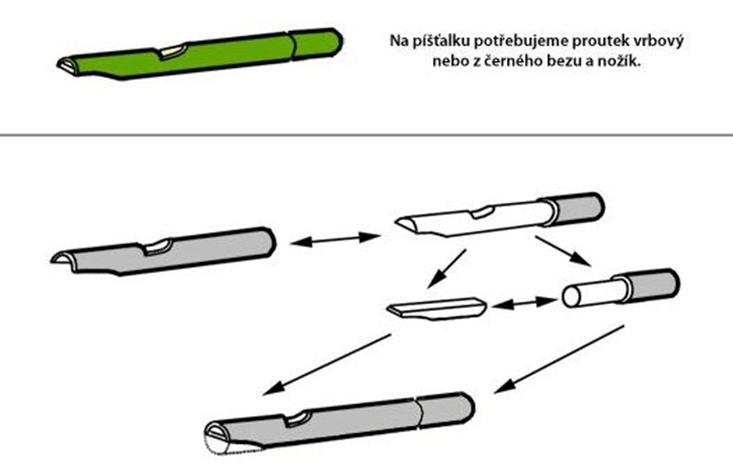 Vyrob si z větvičky vrby píšťalku. Vyhledej jeřáb nebo vrbu, ale ne vrbu jívu, protože jak víš, její „kočičky“ poskytují první potravu včelám. Uřízni si rovnou větev v místě, kde je silná asi jako prst. Ze silnějšího konce větve uřízni asi šesticentimetrový kousek. Nejprve vyřízni malý obdélníkový kousek kůry pro otvor píšťalky, asi v jedné čtvrtině klacíku. Snaž se rozříznout kůru tak, aby dřevo pod ní bylo ostřím nože jen lehce označeno. Asi v polovině délky budoucí píšťalky prořízni kůru kolem dokola. A teď přichází to hlavní: je třeba z poloviny píšťalky stáhnout kůru. Pak naklepej polovinu píšťalky, ve které jsi vyřízl otvor, střenkou nože pěkně kolem dokola, aby se kůra uvolnila. Po chvíli zkus opatrně zakroutit a jemně naráz stáhnout kůru z celé poloviny. Nepůjde-li to lehce, znovu kůru naklepej. Nepospíchej a buď pečlivý, aby se ti kůra neroztrhla. Pak opatrně vyřízni žlábek asi v polovině holého dřeva. Nedělej ho moc hluboký, můžeš ho později prohloubit. Od žlábku ke konci píšťalky seřízni tenký plátek, aby vznikl po navlečení kůry otvor pro foukání. Opatrně nasuň sloupnutou kůru zpět tak, aby otvor v kůře byl nad žlábkem – a píšťalka je hotová! Foukni do otvoru a poslouchej, jaký tón vyluzuje. Můžeš ho změnit tím, že prohloubíš žlábek nebo posunutím kůry změníš polohu otvoru. Aby se píšťalka držela lépe v ústech, můžeš ještě její konec ze spodní strany šikmo seříznout. Posunováním kůry při foukání píšťalku vyladíš. Ano, je to pracné, ale pokus se udělat píšťalku sám a uvidíš, že z ní budeš mít daleko větší radost než z té kupované!
